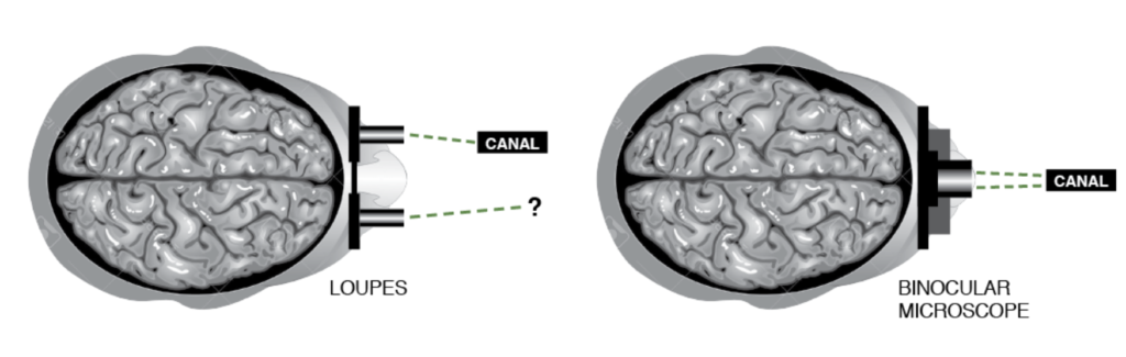 Not sure if you can compare a convergence optical system that our headworn microscope is, with the loupes.